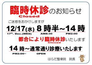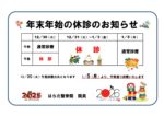 2025年12月15日 / 最終更新日 : 2025年12月15日 harada_16187982 お知らせ 年末年始の休診のお知らせ 今年は、12月30日(火)の午前中まで診療いたします。 12月30日午後から来年1月4日(日)まで休診といたします。 来年1月5日(月)から通常通りに診療いたします。 来年のご予約は、お早めにご連絡ください。 コメントを残す コメントをキャンセルメールアドレスが公開されることはありません。 ※ が付いている欄は必須項目ですコメント ※ 名前 ※ メール ※ サイト 次回のコメントで使用するためブラウザーに自分の名前、メールアドレス、サイトを保存する。 上に表示された文字を入力してください。