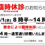 2026年3月30日 / 最終更新日 : 2026年3月30日 harada_16187982 お知らせ 臨時休診のお知らせ 4/1(水)8時半~14時まで、都合により臨時休診といたします。 14時(午後2時)からは、通常通りに診療いたします。 ご不便をおかけしますが、よろしくお願いいたします。 コメントを残す コメントをキャンセルメールアドレスが公開されることはありません。 ※ が付いている欄は必須項目ですコメント ※ 名前 ※ メール ※ サイト 次回のコメントで使用するためブラウザーに自分の名前、メールアドレス、サイトを保存する。 上に表示された文字を入力してください。