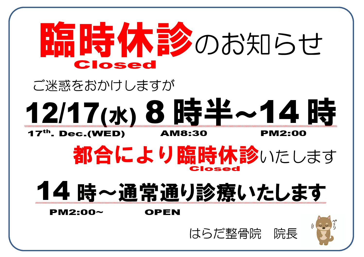2025年12月15日お知らせharada_16187982 臨時休診のお知らせ12/17(水)8時半~14時まで、都合により臨時休診といたします。 14時(午後2時)からは、通常通りに診療いたします。 ご不便をおかけしますが、よろしくお願いいたします。