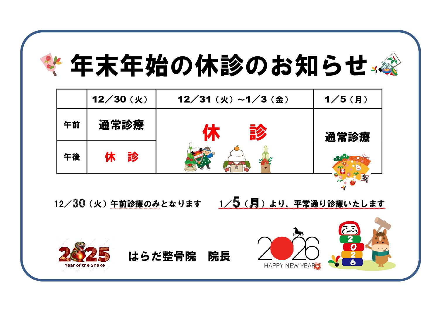 2025年12月15日お知らせharada_16187982 年末年始の休診のお知らせ今年は、12月30日(火)の午前中まで診療いたします。 12月30日午後から来年1月4日(日)まで休診といたします。 来年1月5日(月)から通常通りに診療いたします。 来年のご予約は、お早めにご連絡ください。