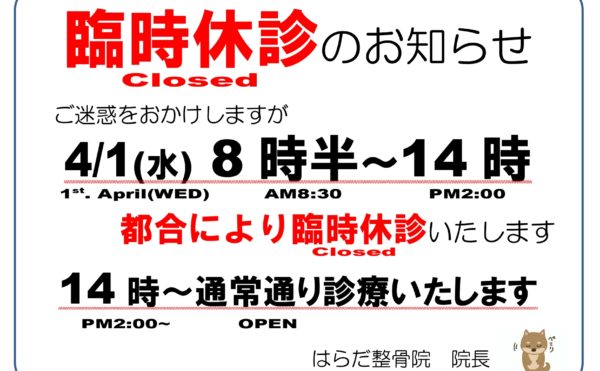 NEW 2026年3月30日お知らせharada_16187982 臨時休診のお知らせ4/1(水)8時半~14時まで、都合により臨時休診といたします。 14時(午後2時)からは、通常通りに診療いたします。 ご不便をおかけしますが、よろしくお願いいたします。